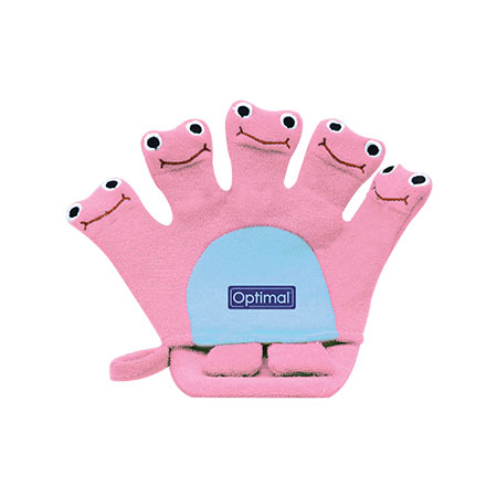 A hand-shaped bath sponge for kids made of thin soft terry. Hot water resistant and washing machine safe.